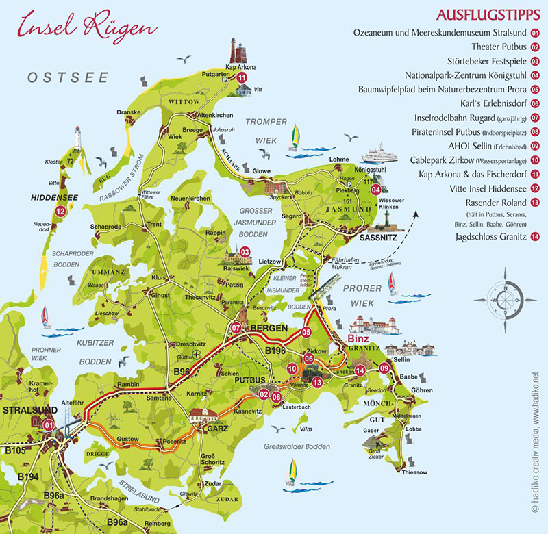 Aus Südwest – Richtung HH, dann A20 bis Stralsund > Aus Südost – Richtung Berlin, A19, dann A20 bis Stralsund > von Stralsund B96 Bergen, die B196 über Zirkow, Serams – Binz. Die Ortseingangsstr. geradeaus, nach Kleinbahnhof ca. 400m linke Seite!